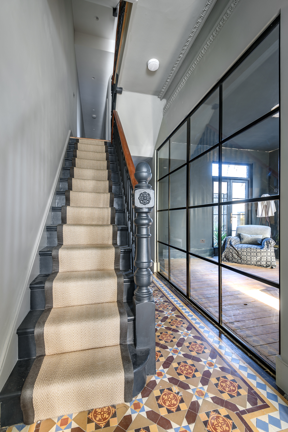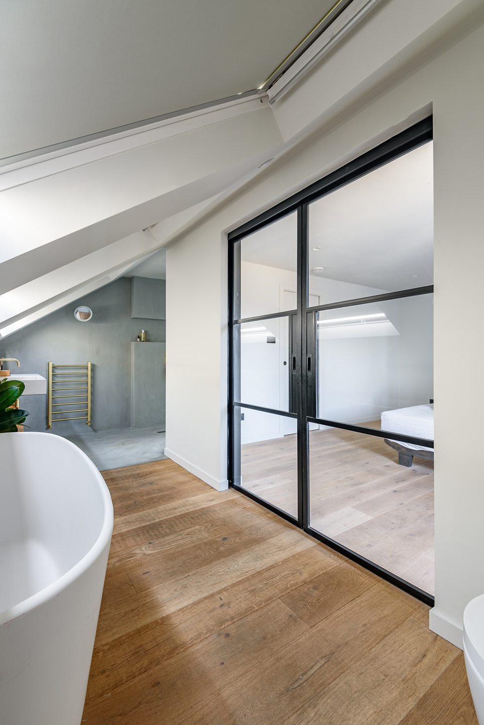 When space is an issue for a steel interior door, we highly recommend our steel internal sliders. They offer a seamless transition from one room to another whilst affording some privacy and sound reduction. By including a pocket it's possible to have a clear walkway whilst maintaining the ability to create a clear divide between spaces. The double pocket door in this contemporary conversion compliments the intended minimalistic design. A pocket door bathroom entry delivers a considered feel to a project.