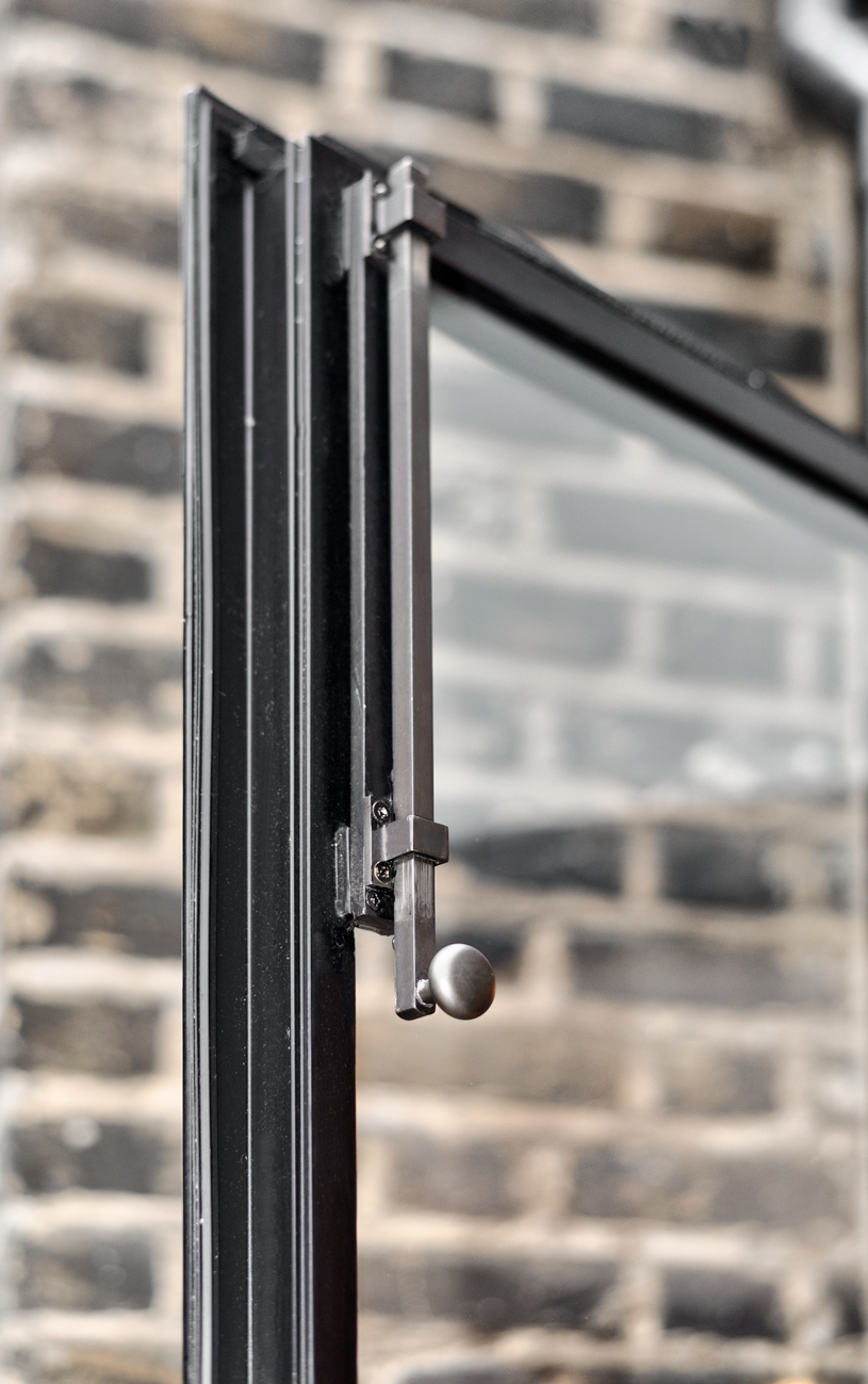 A beautiful door deserves ironmongery to match. So as standard we fit Frank Allart designer English made ironmongery. One of the key advantages of steel over aluminium is the flexibility with door furniture. So instead of shiny aluminium handles you can choose from a choice of crafted handles that are specifically designed for use in high end residential environments.